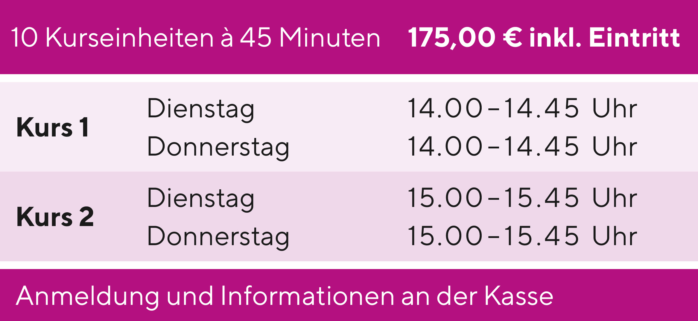 Bitte beachten Sie, dass an Feiertagen und während der bayerischen Schulferien keine Kurse stattfinden.